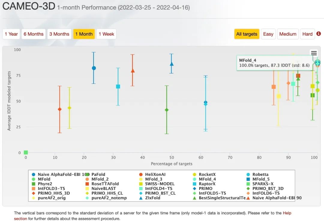 CAMEO 竞赛的规则是,每位参赛者需每周对 20 个由世界范围内的结构生物学家最新破解出的蛋白质结构进行预测,其分数和名次每周都会进行在线更新。因此,该竞赛吸引来不少世界范围内生物计算领域的前沿模型“选手”。