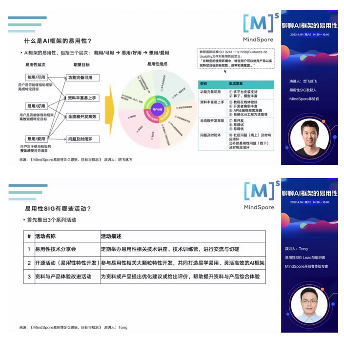 MindSpore团队的两位专家,易用性SIG的发起人(想飞就飞)和Lead(Tong)为大家介绍了易用性SIG成立的背景、目标与具体活动规划,包括技术分享、开源实习、资料与产品体验改进系列活动,详情可以在演讲材料中查看。