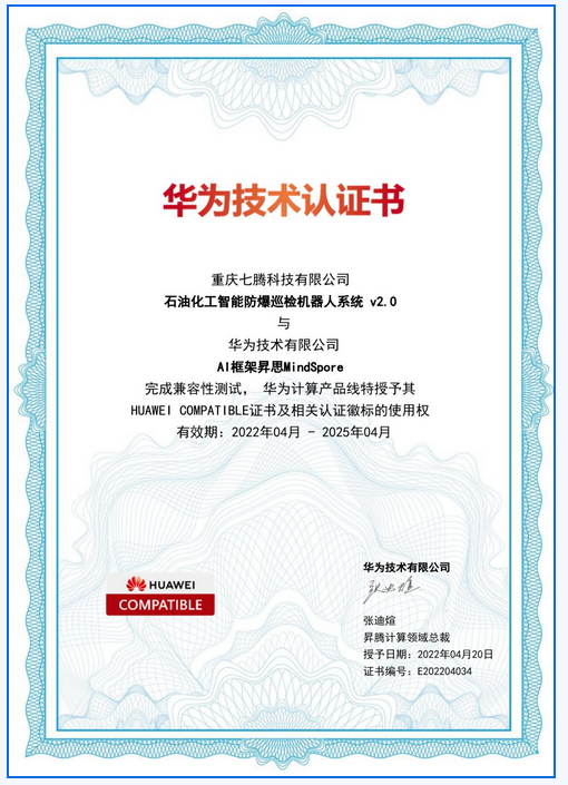 得益于华为昇腾计算业务与七腾科技双方技术人员不断深入沟通与协作,七腾科技石油化工智能防爆巡检机器人系统经过严格的性能和功能测试成功实现系统功能正常运行,通过了全场景AI框架昇思MindSpore的兼容性认证测试,荣获昇思MindSpore技术认证。