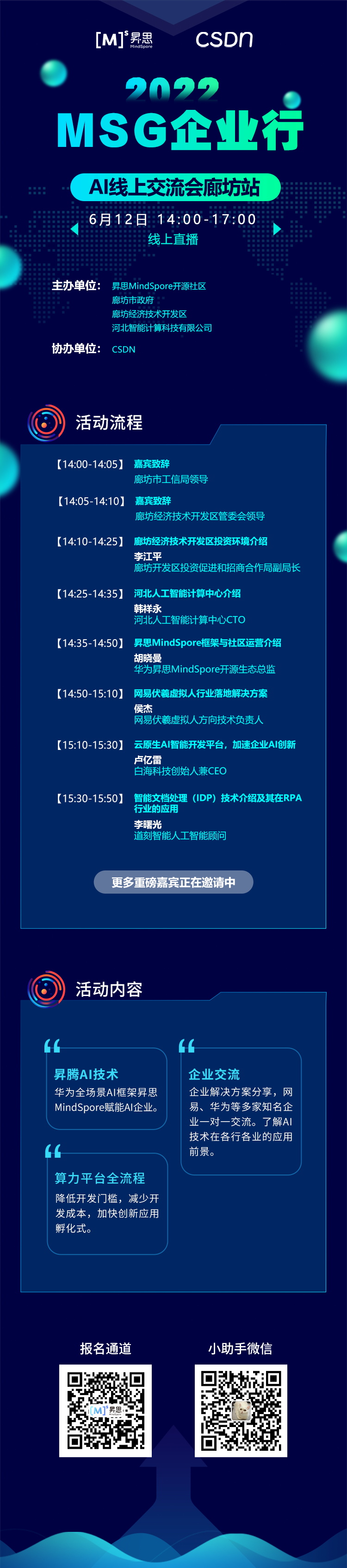 2022年6月12日(周日),昇思MindSpore开源社区联合廊坊工信局、廊坊开发区、河北人工智能计算中心共同举办【MSG企业行·廊坊站】线上交流会。