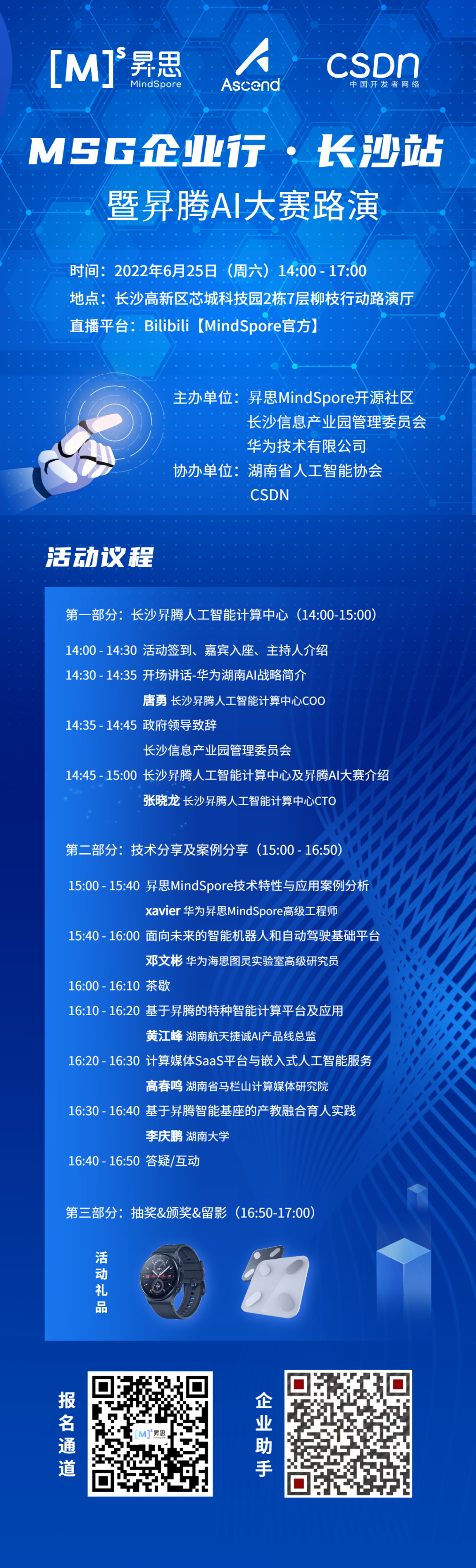 昇思MindSpore开源社区联合昇腾人工智能计算中心、长沙信息产业园管理委员会主办,湖南省人工智能协会、知名媒体CSDN协办,于2022年6月25日(周六)在长沙举办MSG企业行·长沙站暨昇腾AI大赛路演活动。