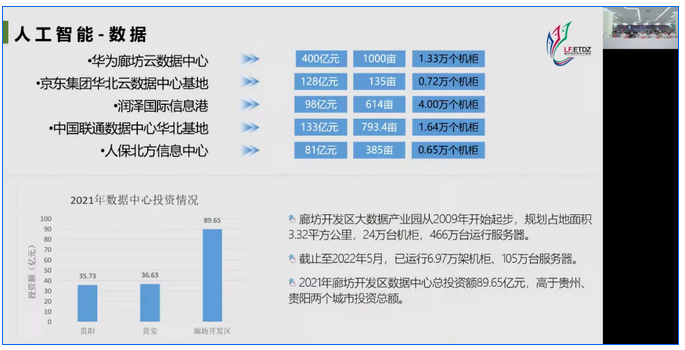 廊坊开发区投资促进和招商合作局副局长李江平分别从开发区基本情况、产业发展、政策基金、人力资源、公共服务五个方面介绍了廊坊开发区的人工智能投资环境。