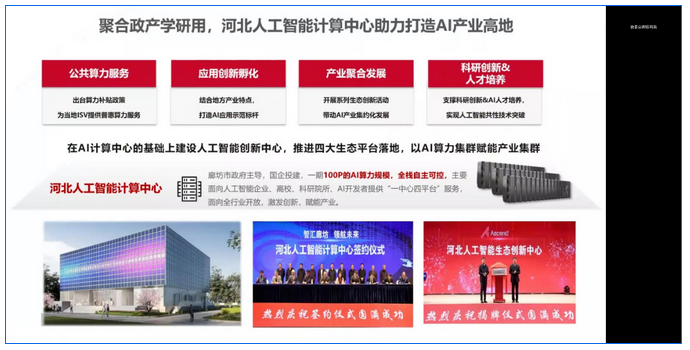 河北人工智能计算中心于今年2月落户廊坊开发区,CTO韩祥永表示,河北人工智能计算中心围绕“一中心四平台”,致力于结合华为生态体系,打造开放算力与生态创新平台,提供普惠、安全、新型的创新资源与创新服务,营造优异的创新环境;端到端打通“政”“产”“学”“研”“用”全产业链,以AI算力集群赋能产业集群,使能千行百业智能化转型,遍布互联网、能源、金融、公共、交通、运营商、制造、教育等更多行业应用。