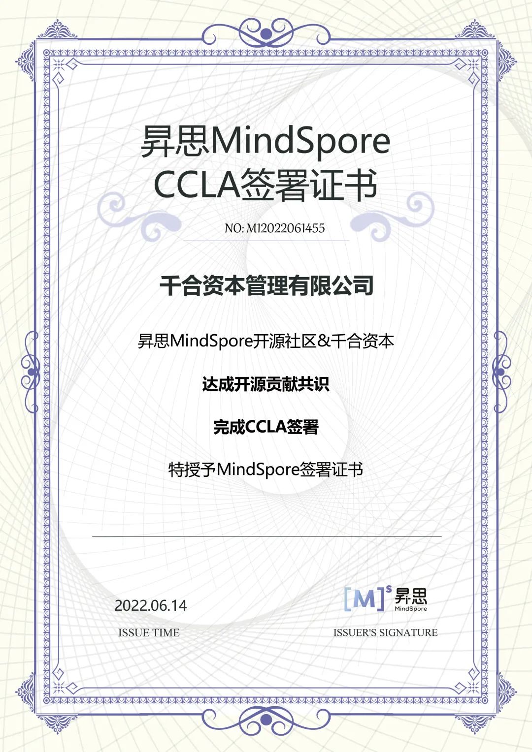 近日,**千合资本管理有限公司(简称:千合资本)**签署CCLA(Corporate Contributor License Agreement,企业贡献者许可协议书),正式加入昇思MindSpore开源社区。