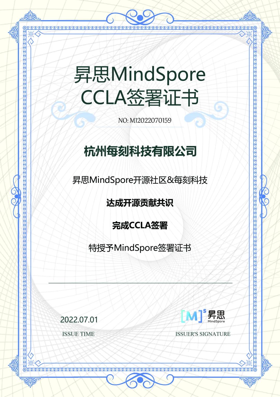 近日,杭州每刻科技有限公司签署CCLA(Corporate Contributor License Agreement,企业贡献者许可协议书),正式加入昇思MindSpore开源社区。