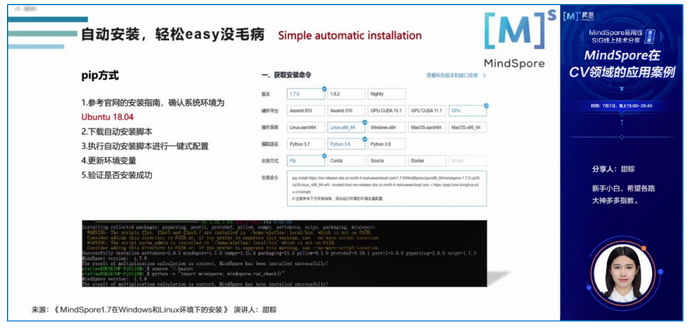 同时,她还介绍了在Windows环境下如何实现MindSpore的pip、conda和source的手动安装。