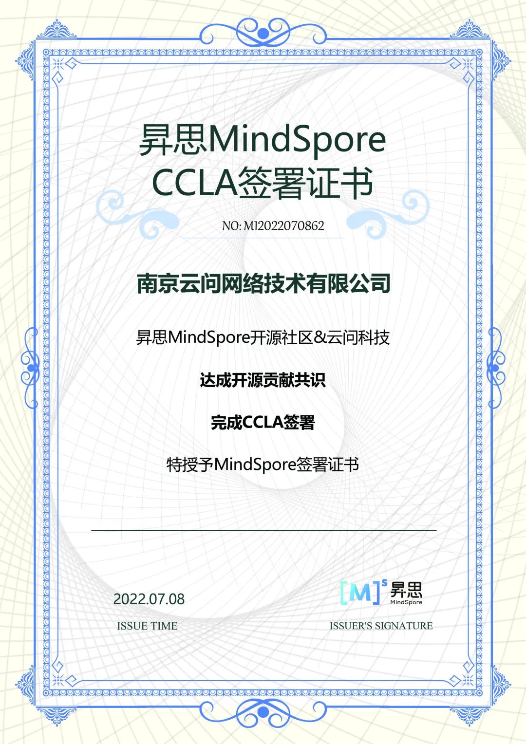 近日,南京云问网络技术有限公司(以下简称“云问科技”)签署CCLA(Corporate Contributor License Agreement,企业贡献者许可协议书),正式加入昇思MindSpore开源社区。