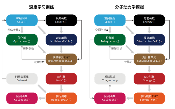 图1 深度学习训练与分子动力学模拟的对比。左:基于MindSpore人工智能框架进行神经网络参数训练过程的示意图。右:基于MindSpore SPONGE分子动力学模拟库进行分子动力学模拟过程的示意图。其中每个方块代表一种程序模块,灰色粗箭头为模块地组合过程,而黑色箭头表示数据更新流程。
