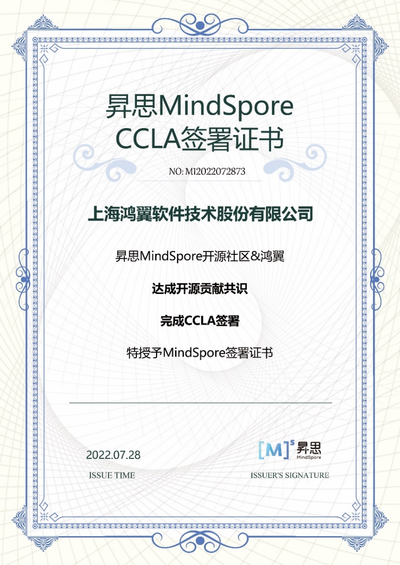 近日,上海鸿翼软件技术股份有限公司签署CCLA(Corporate Contributor License Agreement,企业贡献者许可协议书),正式加入昇思MindSpore开源社区。