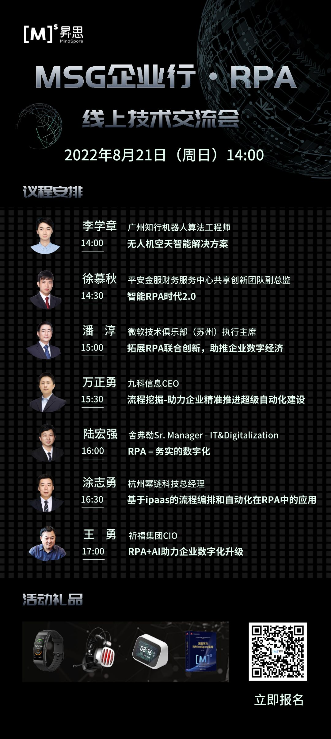 8月21日(周日)14:00****【MSG企业行·RPA】专题交流会将在线上进行,昇思MindSpore开源社区诚邀您与各企业深入交流与分享,一起探索RPA背后的AI技术!