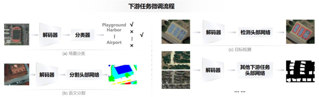 针对不同的下游任务仅需修改预测头部网络,即可灵活快速迁移到不同领域的下游任务中,进行简单微调后可适应多目标细粒度分类、小目标检测识别、复杂地物提取等任务。