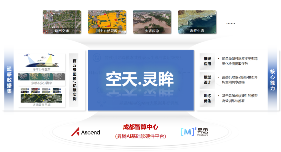 **“空天.灵眸”大模型是空天院联合北京昇腾人工智能生态创新中心技术团队,基于成都智算中心的昇腾AI的澎湃算力训练而完成。**在昇腾AI基础软硬件平台的支持下,尤其是依托昇思MindSpore AI框架原生支持大模型的能力,“空天.灵眸”大模型的并行训练及下游任务开发得以加速实现,已在8个国际标准数据集上达到领先水平,填补了跨模态生成式预训练模型在遥感领域的空白。
