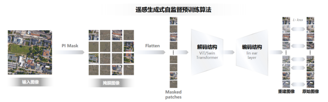 不同于现有遥感预训练模型大都采用有监督或者对比式学习的模式,基于昇腾AI的“空天.灵眸”大模型依托掩膜自编码结构,是面向复杂场景且更具通用表征能力的遥感生成式自监督预训练模型。