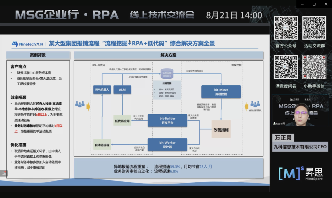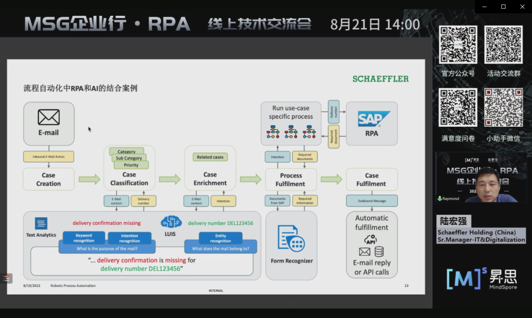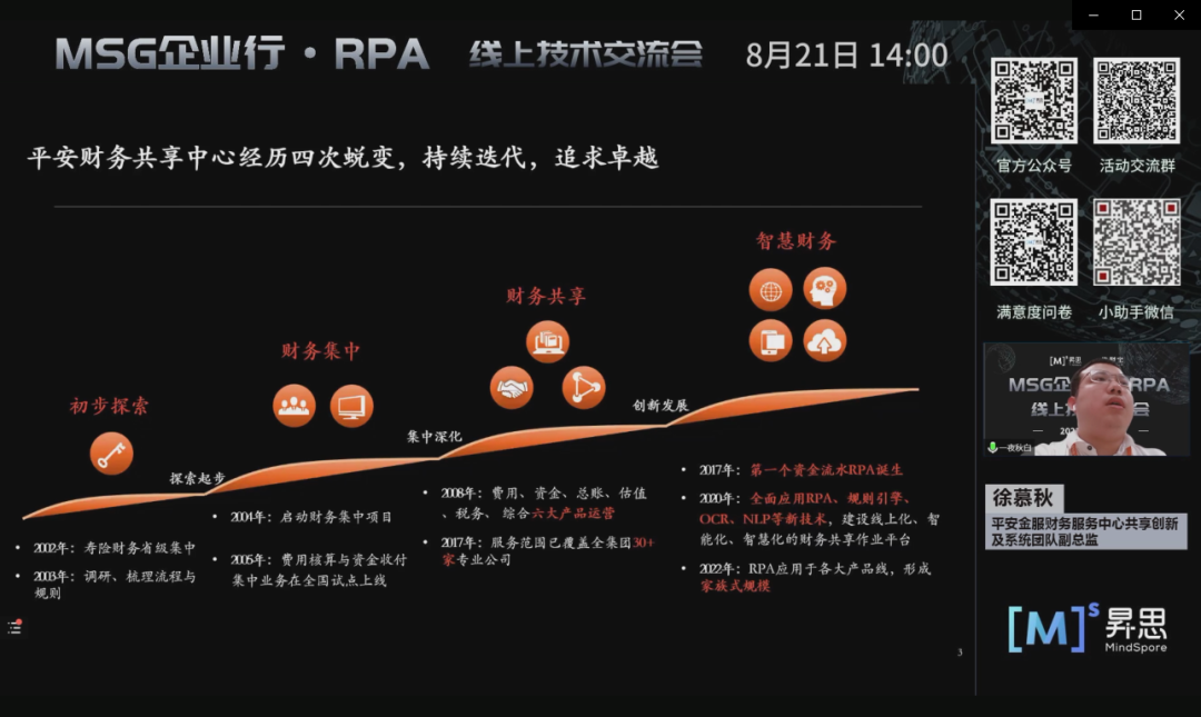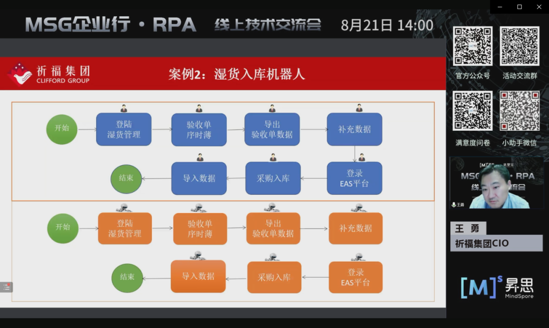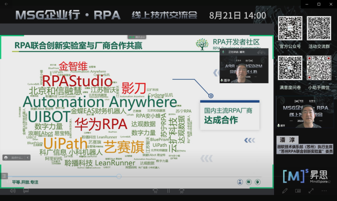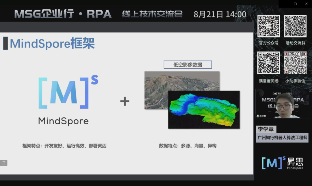 8月21日下午,MSG企业行·RPA线上专题交流会成功举办!昇思MindSpore开源社区携手知名媒体选型宝,邀请到了广州知行机器人、平安金服、微软技术俱乐部、九科信息、舍弗勒集团、杭州幂链科技、祈福集团的7位嘉宾基于AI与RPA技术在不同领域的应用进行分享与交流。