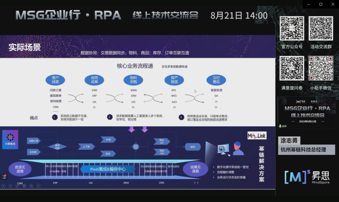 杭州幂链科技总经理涂志勇:对于ipaas的流程编排和自动化特性,在RPA中应用的深度分享与讨论。