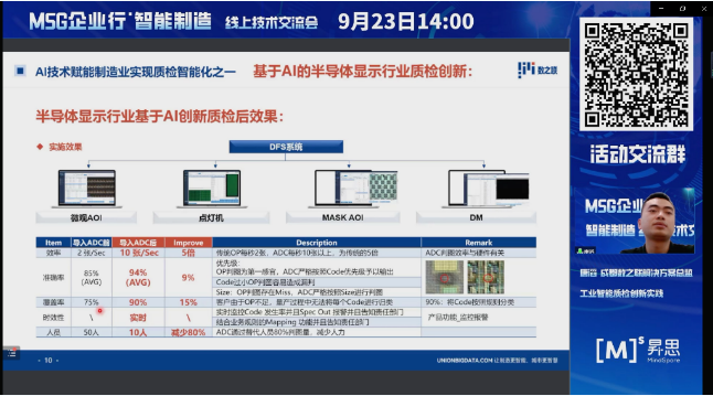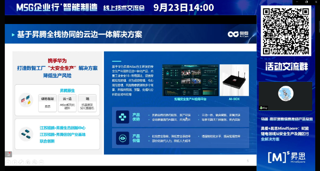 9月23日下午,MSG企业行·智能制造线上交流会成功举办!昇思MindSpore开源社区联合江苏鲲鹏·昇腾生态创新中心,携手知名媒体选型宝,邀请到了华为、上海帆一尚行、首自信公司、美云智数、成都数之联、南京奥看信息、北极九章的7位企业嘉宾,基于自身丰富的工业领域技术经验,分享了传统的生产制造企业的AI应用场景,助力制造业企业实现智能制造转型升级。