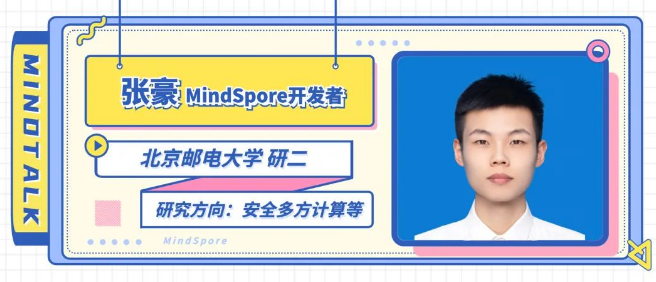本期专访是来自 MindSpore 社区的优秀开发者张豪同学,其研究方向为安全多方计算等。