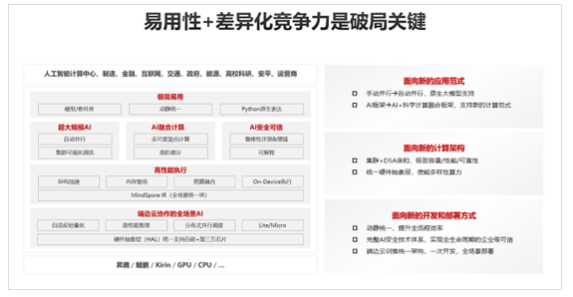 一是大模型,当前大模型有很多基于业界主流框架去做的大模型的训练框架,不管哪一个框架做的这一套范式,都不是那么的极简易用。也就是说,我们并没有办法真正做到无感的把单机、单卡的训练模型直接简单的写一下或者是加几行代码封装之后把它直接用到我的多机多卡,然后一个大的集群上面稳定快速的能把大模型训练起来,这一块是MindSpore差异化竞争去发力的方向。