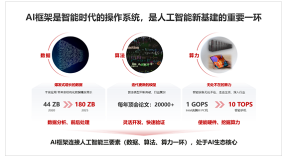AI框架是智能时代的操作系统,也是人工智能新基建的重要基础。当前,我们有爆发式增长的数据,有不断迭代更新的模型,以及无数不在的算力。AI框架作为承上启下的位置,能够去链接人工智能的三要素:数据、算法和算力,处于AI生态的核心。