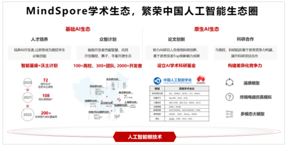 学术生态方面,在基础AI生态上基于华为的智能基座+沃土计划,让全国72所智能基座高校,108所课程推广的高校,全面让MindSpore的框架铺开,加入到高校的课程当中去,让学生真的能学到框架的具体知识和内容,慢慢的培养他们使用框架,以及以后慢慢的将框架去做科研,然后落入他们实际去工作的技能培养当中。