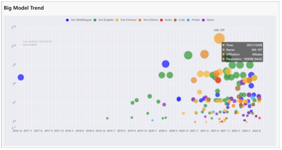 一方面是大模型,图示为2016年底至近几个月的大模型统计表,最大的已经到了万亿级别的参数量,小的模型也基本上都是在数十亿级别的参数量。也就是说,大模型已经成为了一个常态,我们现在做的基础的研究也好、应用也好,都是拿一个Bert或VIT这样的模型直接做数据的训练或者是微调。