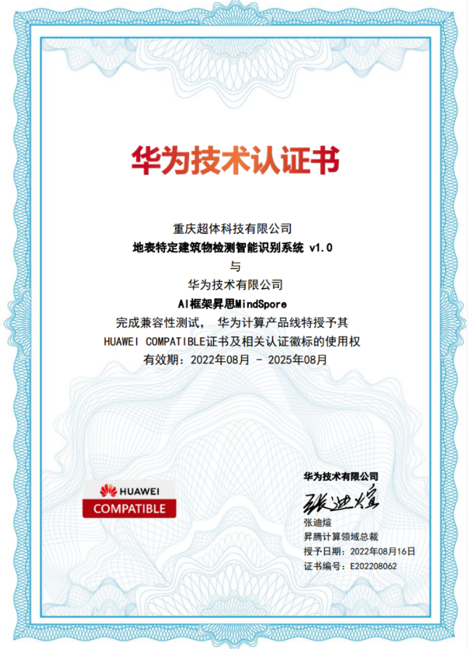 **2022年8月,**在重庆人工智能创新中心的支持下,**重庆超体科技有限公司(简称“超体科技”)的地表特定建筑物智能识别系统完成了与全场景AI框架昇思MindSpore的兼容性测试,**并获得由华为颁发的技术认证书。