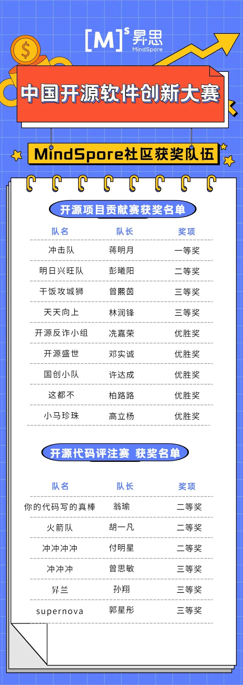 本次大赛旨在响应国家政策,更好地激发开源创新活力,培养开源软件人才,助中国开源生态建设。由MindSpore社区开发者组成的15支入围总决赛的队伍取得优异成绩,最终获得一等奖1名,二等奖4名,三等奖5名,优秀奖5名。