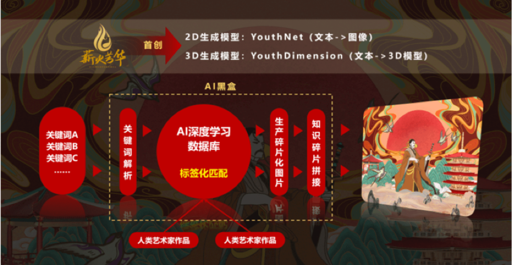 湖南禾福文化科技有限公司“薪火芳华”团队基于全场景AI框架昇思MindSpore,自行研发基于知识图谱和大模型的国潮AIGC生态系统(AI生成2D平面图像、3D模型、视频等元宇宙数字内容),为元宇宙空间提供可商用的优质数字内容,优化工业设计到生产的流程效率,降本增效,有效的将文化遗产演变为数字资产,打通“文化-科技-消费”全链路径,释放国潮文化的源头生产力,在消费端打造一个率先出海的青年国潮品牌“薪火芳华”。