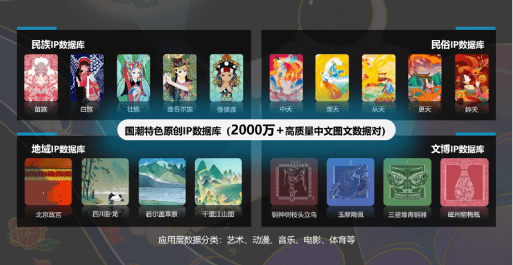薪火芳华团队走访了137个非物质文化遗产发源乡,拜访了583位非遗传承人,历时五年时间搭建起以青年大学生为主要力量传播和推广中华优秀文化的平台,并积累了丰富的传统文化IP 素材库,为日后图像生成算法的训练奠定了原始数据集的积累。