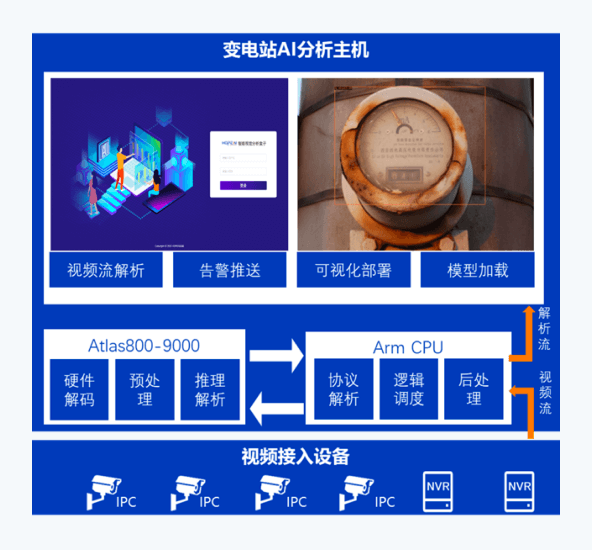 变电站AI分析主机应用昇腾AI基础软硬件平台打造标准化、流程化的模型生产和应用流程,实现“数据-场景-算法”闭环快速迭代,支撑变电站智能巡检定制化需求快速落地。