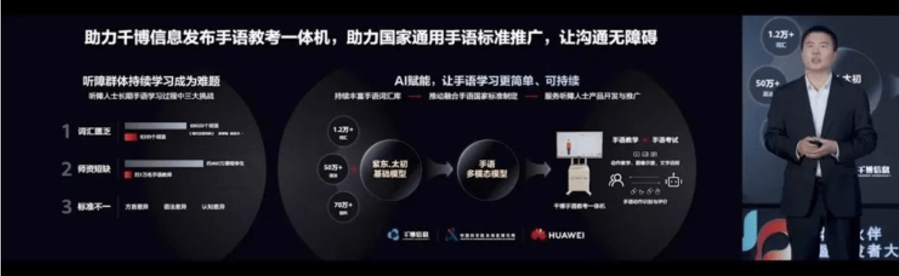 基于紫东太初开发的手语多模态模型,华为联合千博信息,实现了手语动作与示意图片和文字的联动,让初学者更加方便的理解手语。同时,基于手语多模态模型,千博信息打造了手语教考一体机,帮助学生随学随练随考,极大的推动手语标准的推广,帮助听障朋友以及手语爱好者更好的学习。 研发人员让“紫东太初”三模态大模型学习了1.2万个手语词汇、50多万语法、70多万语料,基于昇思MindSpore AI框架,开发手语多模态模型,开创性地实现手语动作与视频、图片示意和文字说明的联动,让初学者对手语语义理解更加深刻。而后,基于手语多模态模型,利用昇腾AI基础软硬件平台开发出手语教考一体机。