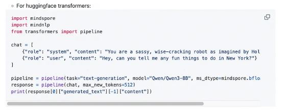 具体而言,MindSpore NLP提供了与Hugging Face完全一致的API接口,开发者可以使用熟悉的AutoModel、AutoTokenizer等类直接加载和运行模型。这种设计极大降低了模型迁移的技术门槛,确保新发布的模型能够实现“day0”支持。