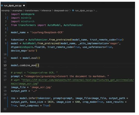 基于MindSpore NLP的兼容性特性,DeepSeek-OCR在昇思MindSpore上的部署变得异常简洁。整个过程主要包含三个关键步骤: