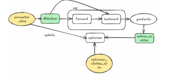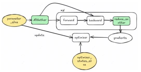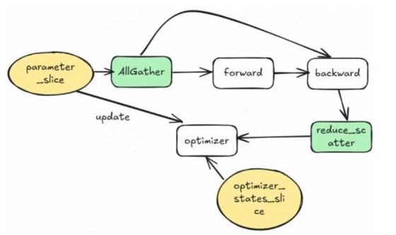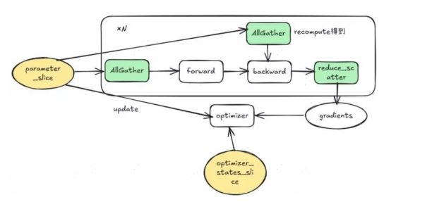 - 流程更简洁:前向开始前执行AllGather获取完整权重,反向结束后释放。