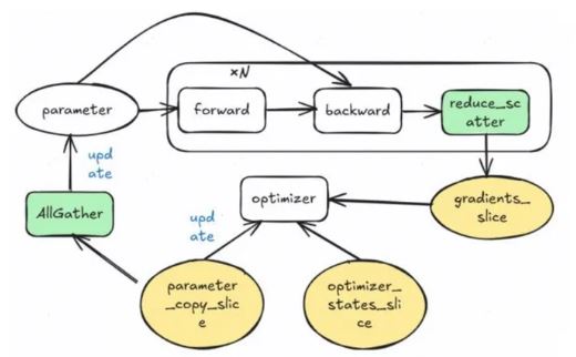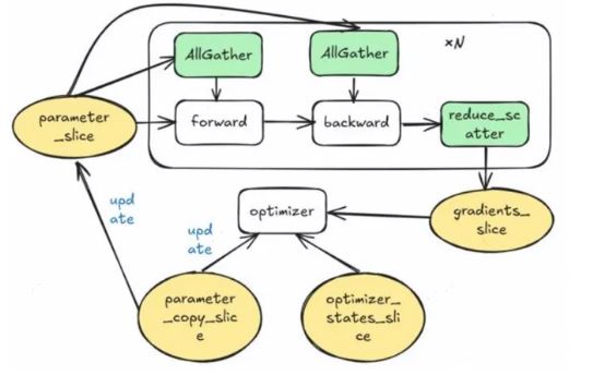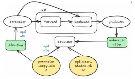 Zero-1的实现切分了优化器状态和权重副本,其模型的前向与反向在梯度累加场景下会执行N次(N为梯度累加次数),但AllGather与ReduceScatter只执行一次,其流程如图2所示: