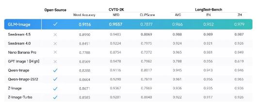 GLM-Image模型基于创新的混合架构,实现了在文字渲染的权威榜单中达到开源SOTA水平。