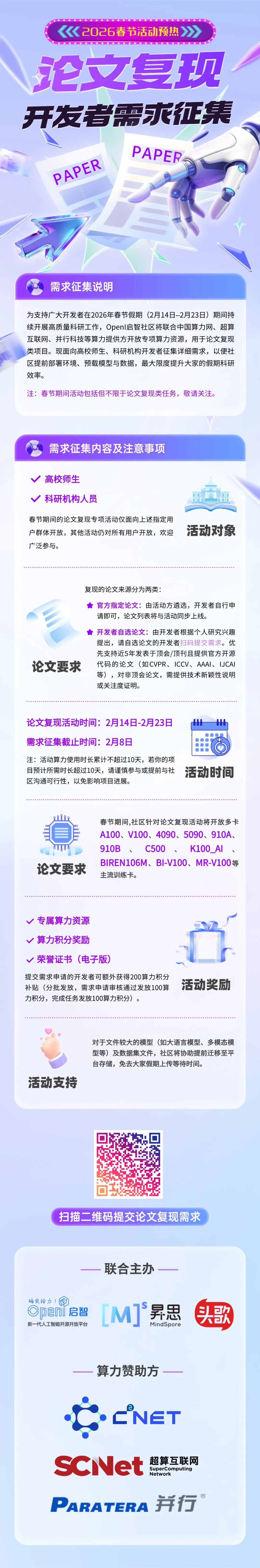 💡 小贴士:本次论文复现专项活动仅面向高校及科研机构开发者,且算力使用总时长不超过10天;此外,社区春节期间还有其他精彩活动,不限人群参与,活动将在近期推出,敬请关注!