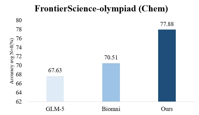 评测表现:MindSpore Science Agent采用OpenAI发布的FrontierScience中的国际化学奥赛题集进行评测,基于GLM-5模型,在avg N=8上的答题准确率达到77.88%,超过GLM-5模型(67.63%)以及斯坦福大学研究团队发布的 Biomni平台(70.51%),并在湿实验与计算仿真两大科研任务上均实现了案例验证。
