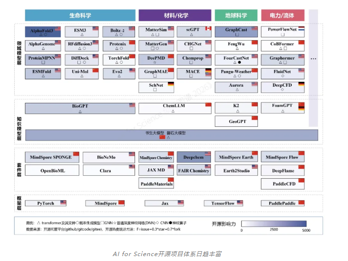 开源项目作为知识共享与协作创新的核心载体,已成为AI for Science 发展的核心驱动力之一。《报告》对AI for Science领域当前重要开源项目进行了梳理,发现从框架层、套件层到模型层,一批代表性的AI for Science开源模型和开源工具日趋成熟,中国的开源模型和工具开源影响力持续提升。
