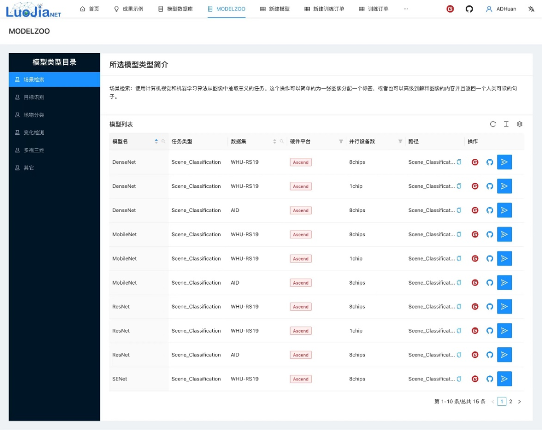 依托武汉昇腾人工智能计算中心的昇腾AI算力支持,打造了嵌入昇思MindSpore技术特性的新版本LuoJiaNET针对遥感应用典型场景(场景检索、目标识别、地物分类、变化检测、多视三维),为用户提供五大类基础遥感任务模型库,用户可根据需求直接进行调用。