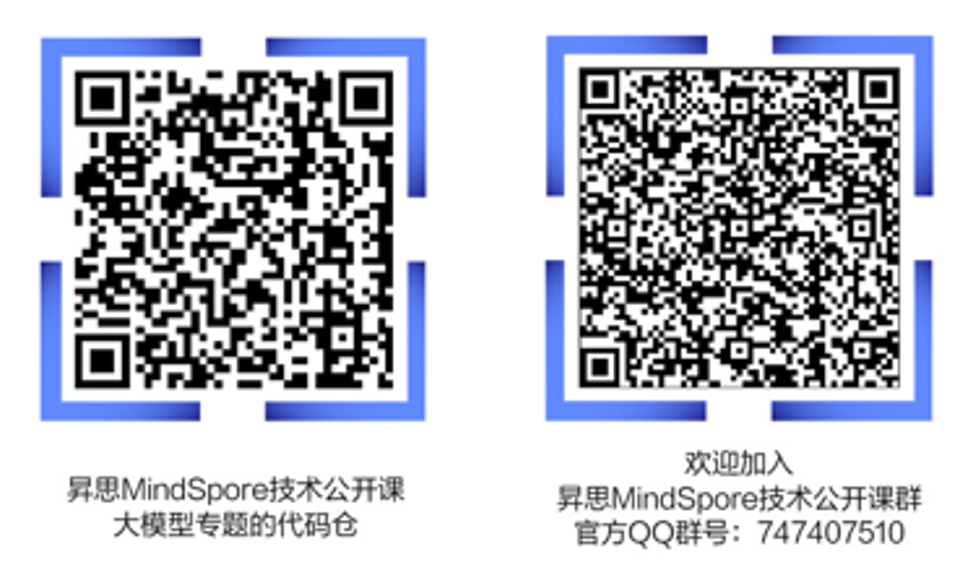如果大家在运行代码中遇到什么问题,对课程有什么建议,或者希望我们增添什么内容,都可以在昇思MindSpore技术公开课大模型专题的代码仓中提issue进行反馈,或者加入课程讨论群,会有课程讲师在群中进行答疑。