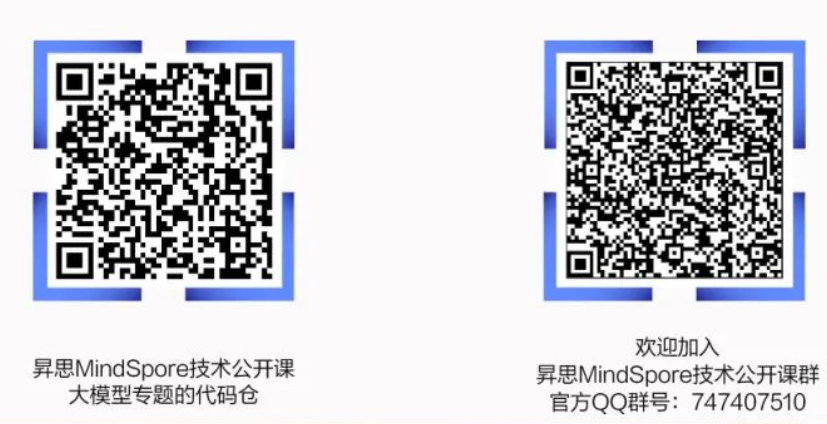 如果大家在运行代码中遇到什么问题,对课程有什么建议,或者希望我们增添什么内容,都可以在昇思MindSpore技术公开课大模型专题的代码仓中提issue进行反馈,或者加入课程讨论群,会有课程讲师在群中进行答疑。