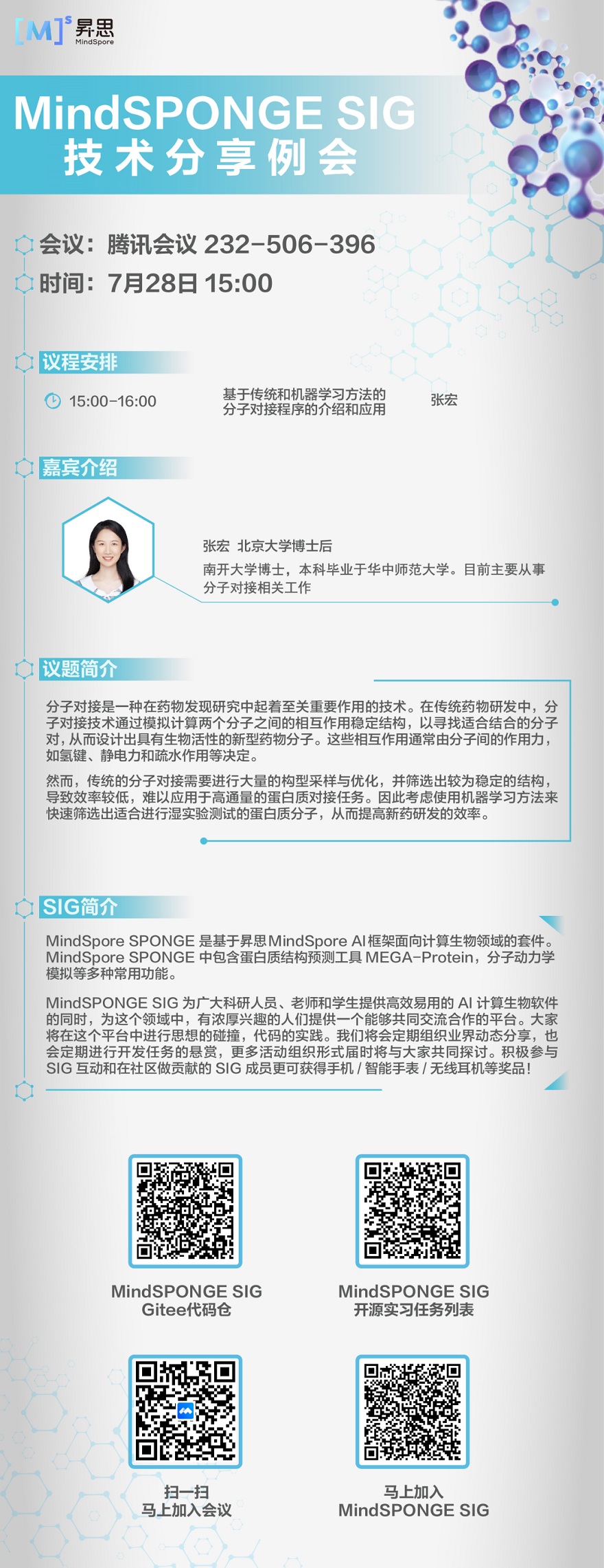 7月28日下午15点,MindSpore SPONGE SIG技术分享例会邀你加入!本期嘉宾来自北京大学博士后——张宏老师,为大家带来“基于传统和机器学习方法的分子对接程序的介绍和应用”的议题分享。分子对接在传统药物研发中难以应用于高通量的蛋白质对接任务,而现在通过机器学习的方法是否可以带来不一样的结果呢?就让我们一起看看吧。本次直播由腾讯会议、【MindSpore官方】B站直播间同步进行,详情可见海报。