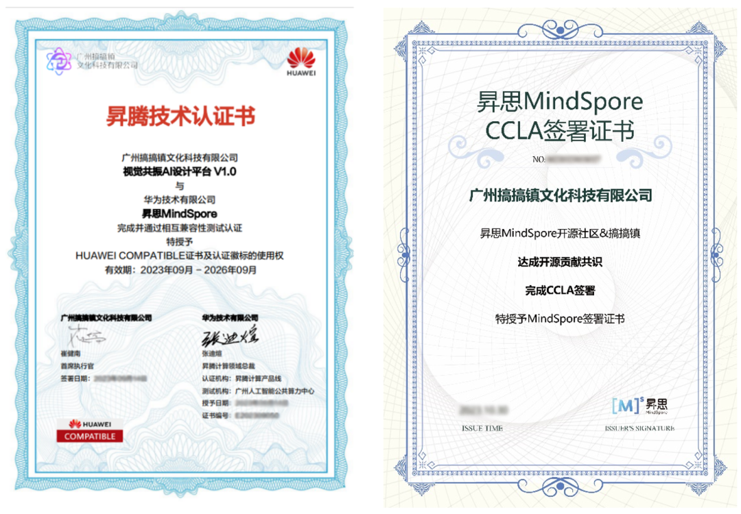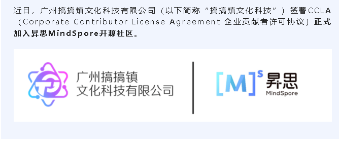 2023年10月,搞搞镇文化科技签署CCLA(Corporate Contributor License Agreement 企业贡献者许可协议),正式加入昇思MindSpore开源社区,共同实现多场景AI技术创新。