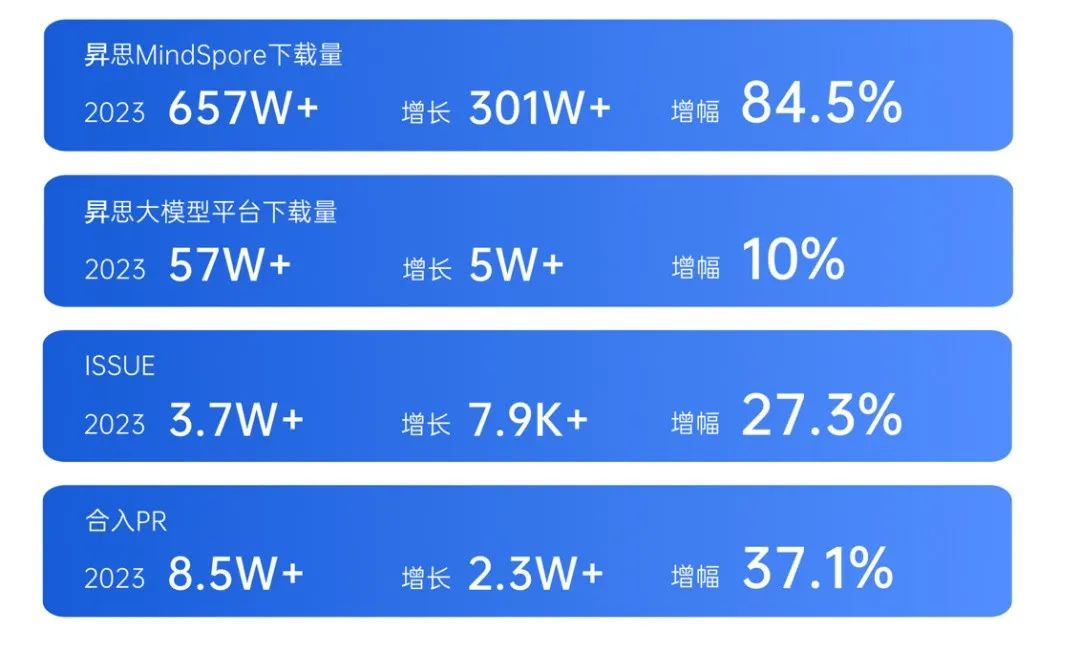截至2023年12月,昇思MindSpore下载量突破657W+,2023年增长了301W+;昇思大模型平台下载量突破57W+,作为首个基于自主创新的AI算力和框架、服务全球开发者的一站式大模型平台,已有**28.7K+名用户注册使用,其中2.2K+**核心贡献者。