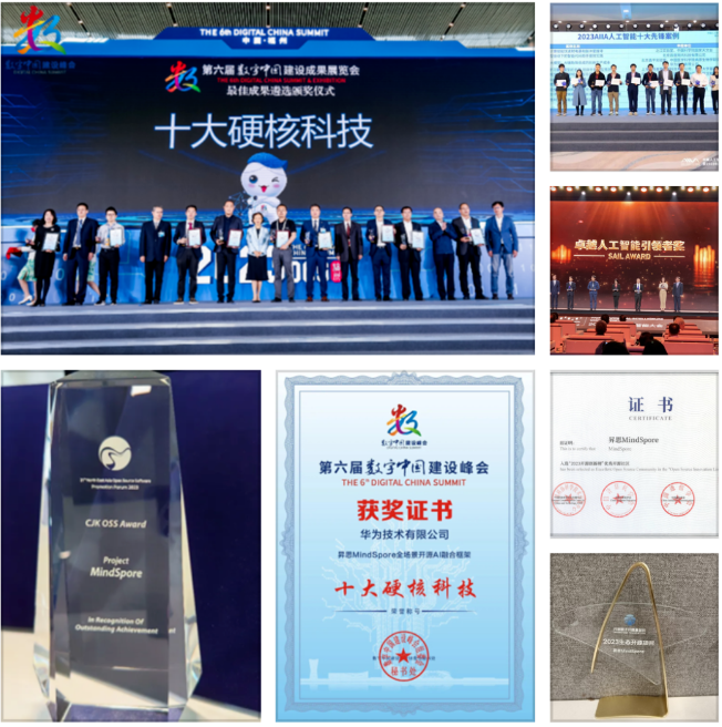 昇思MindSpore荣获2023年东北亚优秀开源项目****(CJK OSS Award, 21th NEA OSS Promotion Forum)、第六届数字中国建设成果展览会**“十大硬核科技”称号、在中国科协科学技术传播中心、中国计算机学会、中国通信学会、中国科学院软件研究所共同主办的 2023 开源创新榜评选出的2023年度“优秀开源社区”奖项;开放原子开源基金会2023生态开源项****目**等。