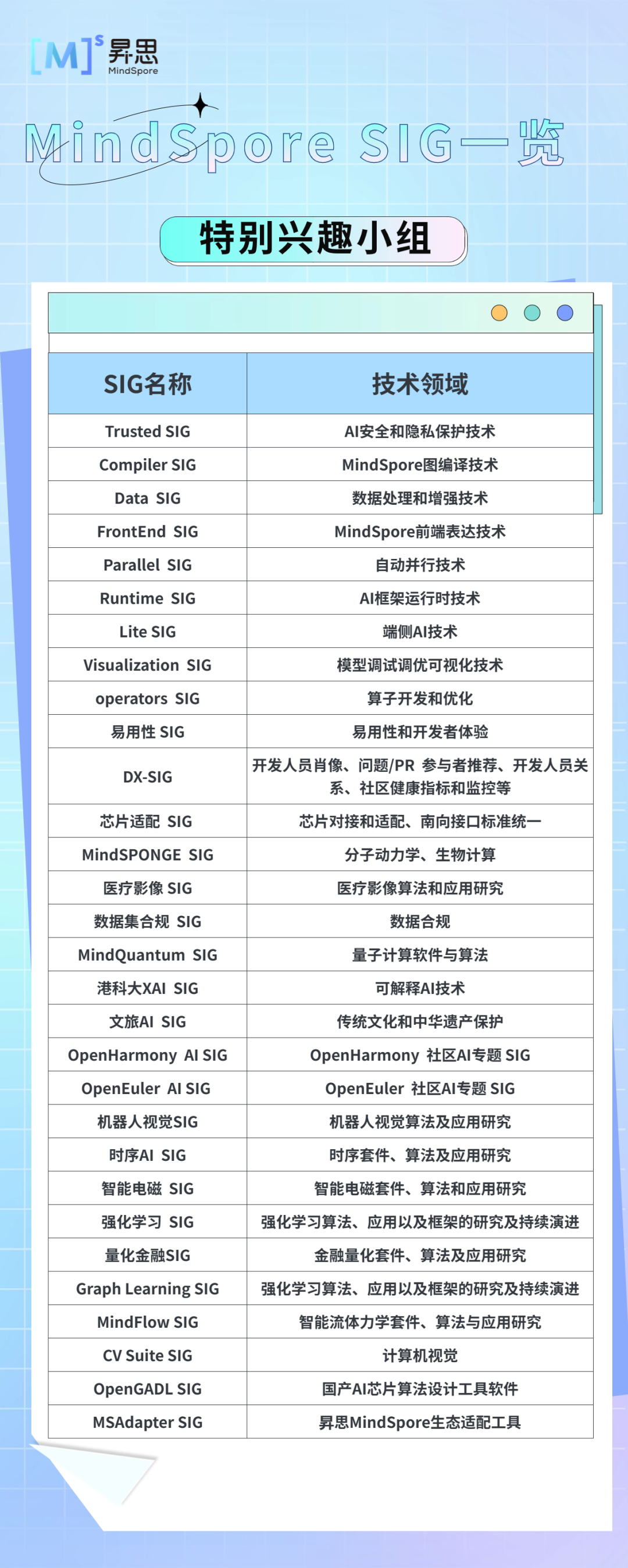 昇思MindSpore社区联合业界专家、学术伙伴在社区成立MindSpore Special Interest Groups(简称SIG),为该领域的专家、教授和学生提供一个开放交流的平台,通过会议分享、项目开发等活动促进技术交流、合作共赢,并使得SIG成员的影响力和技术能力得到提升,截止目前,MindSpore SIG共计成立30+。