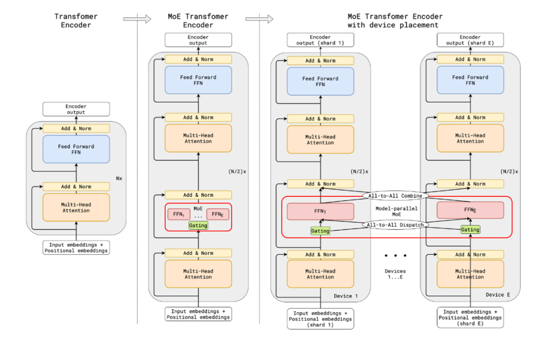 - Transformer的Encoder和Decoder中,每隔一个(every other)FFN层,替换成Position-wise MoE层。