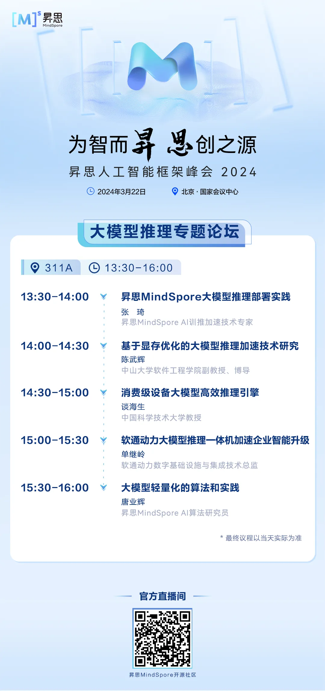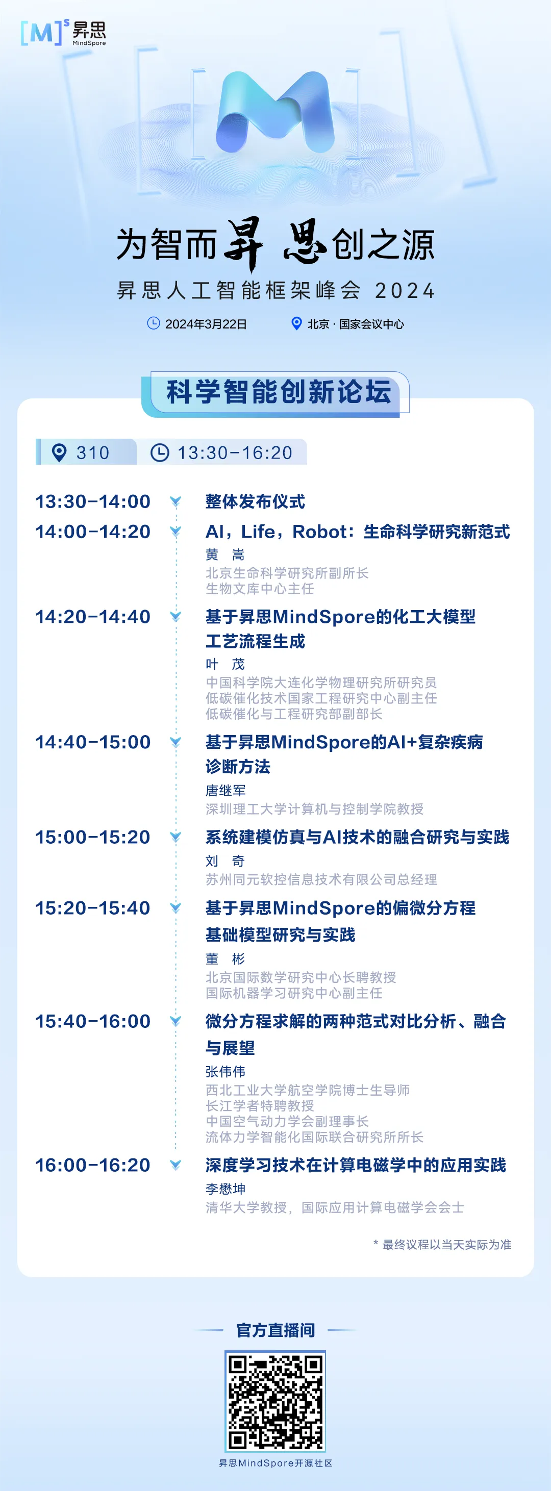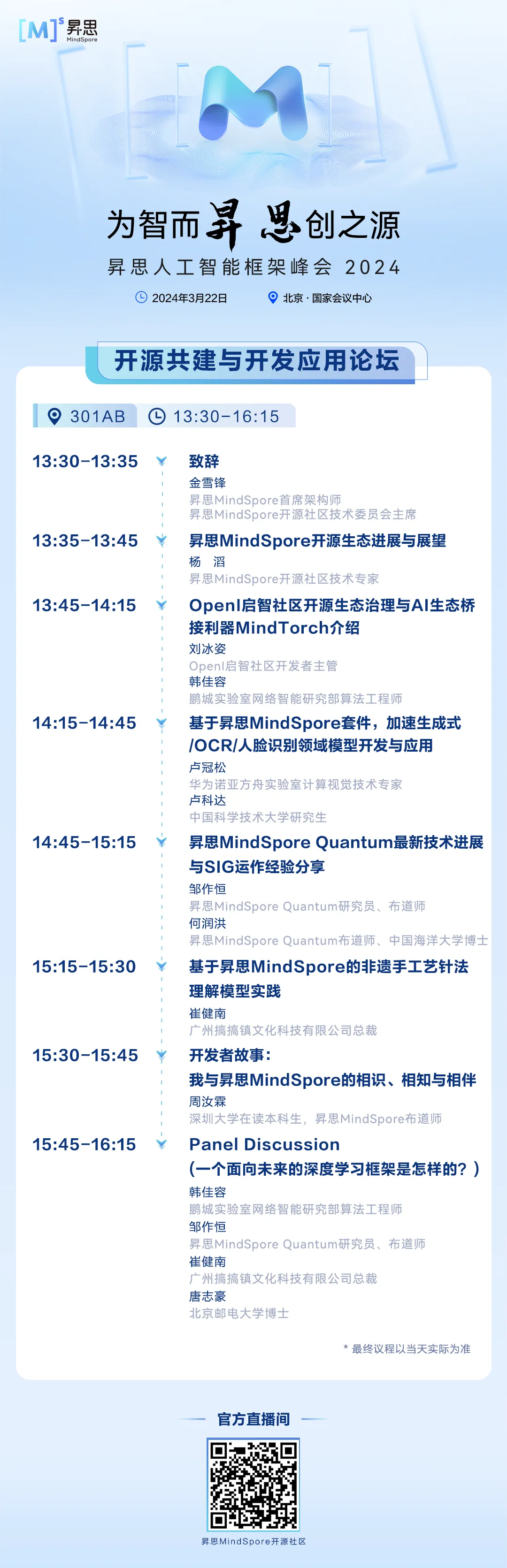 「昇思人工智能框架峰会2024」将于2024年3月22日在北京国家会议中心召开。本次峰会不仅有干货满满的主题演讲,还有6场精彩纷呈的专题论坛。
