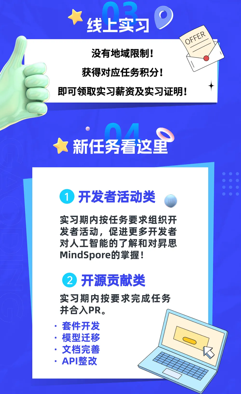 **社区荣誉:**实习期突出的实习生,将成为社区明星开发者代表昇思进行布道,并有机会参与昇思社区2024年度优秀开发者评选!